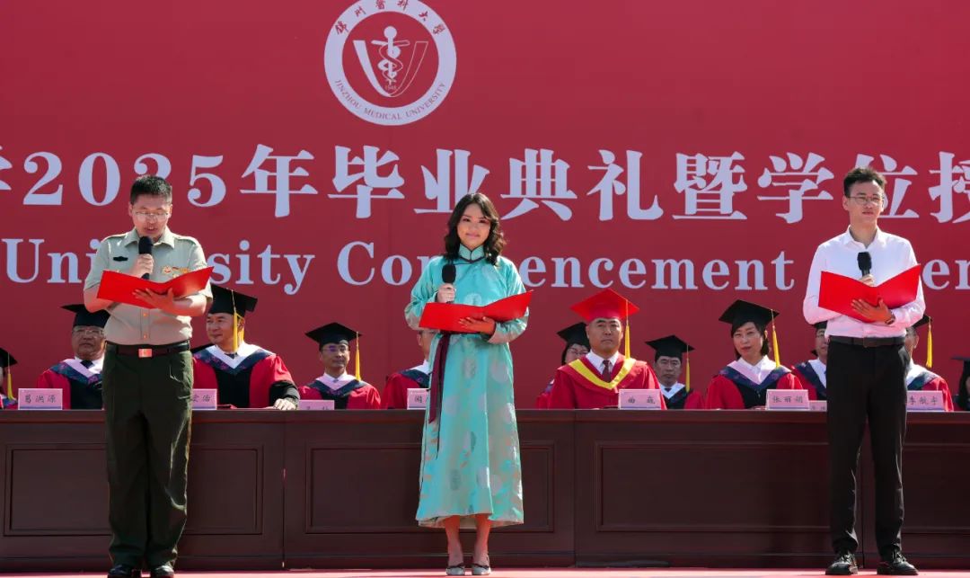 今朝远航,且将学识酬天地,常怀赤子情。2025届本科毕业生代表马丰源、研究生毕业生代表朱长帅、留学生毕业生代表艾雅共同分享了在锦医求学的青春历程。他们用诗朗诵的形式,深情回忆了在学习、科研、实践和文化浸润下的成长蜕变故事,感谢母校给予每一名毕业生的信念、知识和成长的力量。把感恩留给母校,把奋斗留给自己。他们代表2025届全体毕业生向母校郑重承诺:感恩锦医,我终为我!感恩锦医,我将无我!踔厉奋发,笃行不怠,让青春在祖国最需要的地方开出最美的花朵!