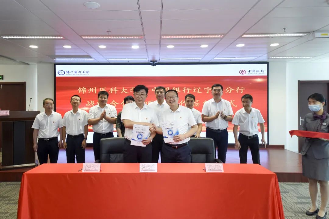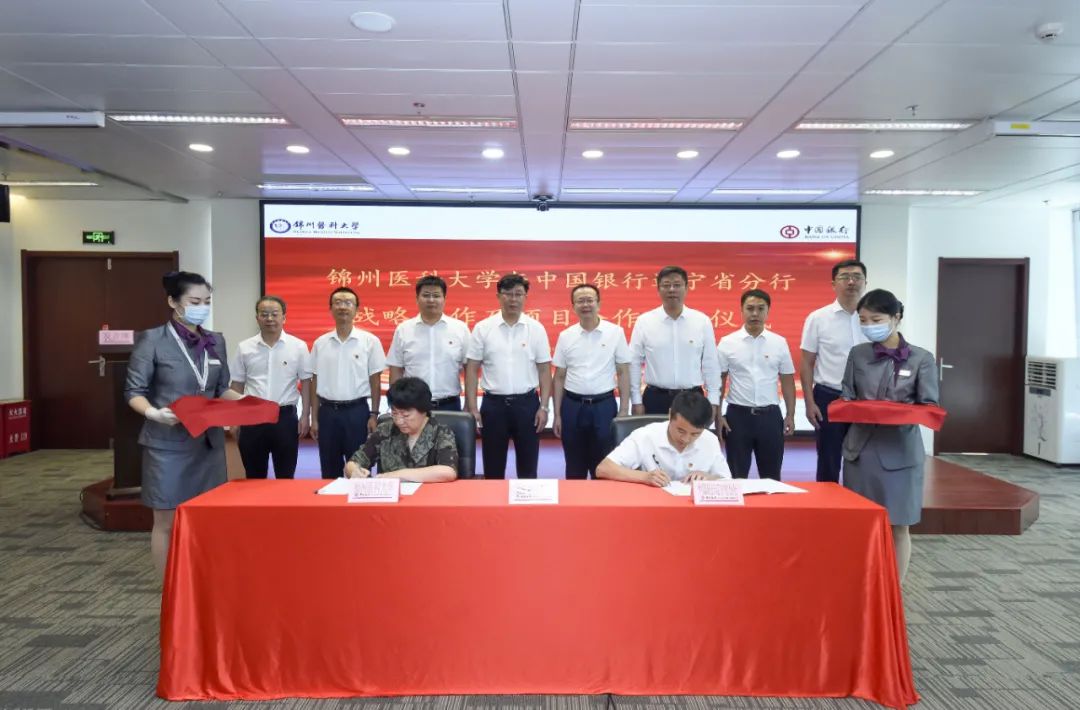 学校财务处处长关霁月与中国银行股份有限公司锦州分行行长孙井泽签署了银校项目合作协议。