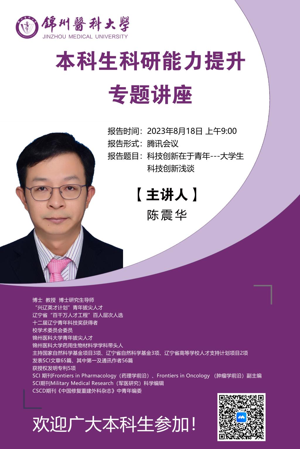 8月18日(本周五)上午9点,科技处特邀我校优秀青年科技专家陈震华教授进行题目为“科技创新在于青年---大学生科技创新浅谈”的线上专题讲座,请各单位组织好本单位的本科生积极踊跃参加。