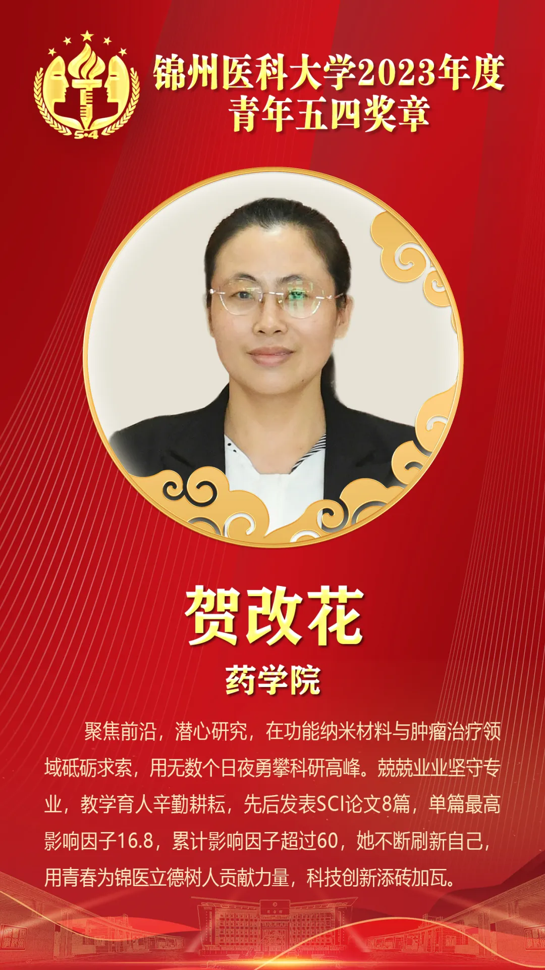 “聚焦前沿,潜心研究,在功能纳米材料可控制备与肿瘤治疗领域砥砺求索,用无数个日夜勇攀科研高峰。兢兢业业坚守专业,教学育人辛勤耕耘,先后发表SCI论文15篇,单篇最高影响因子23.6,累计影响因子超过110,她不断刷新自己,用青春为锦医立德树人贡献力量,科技创新添砖加瓦。”在学校举办的纪念五四运动105周年暨2024年五四青年节表彰大会上,给予药学院贺改花的颁奖词温暖有力,令人钦佩。在颁奖台上,她用心用情分享了在锦医的成长之路,教学相长的青春点滴,讲述了与青年学子共赴一场心灵旅程的锦医故事。
