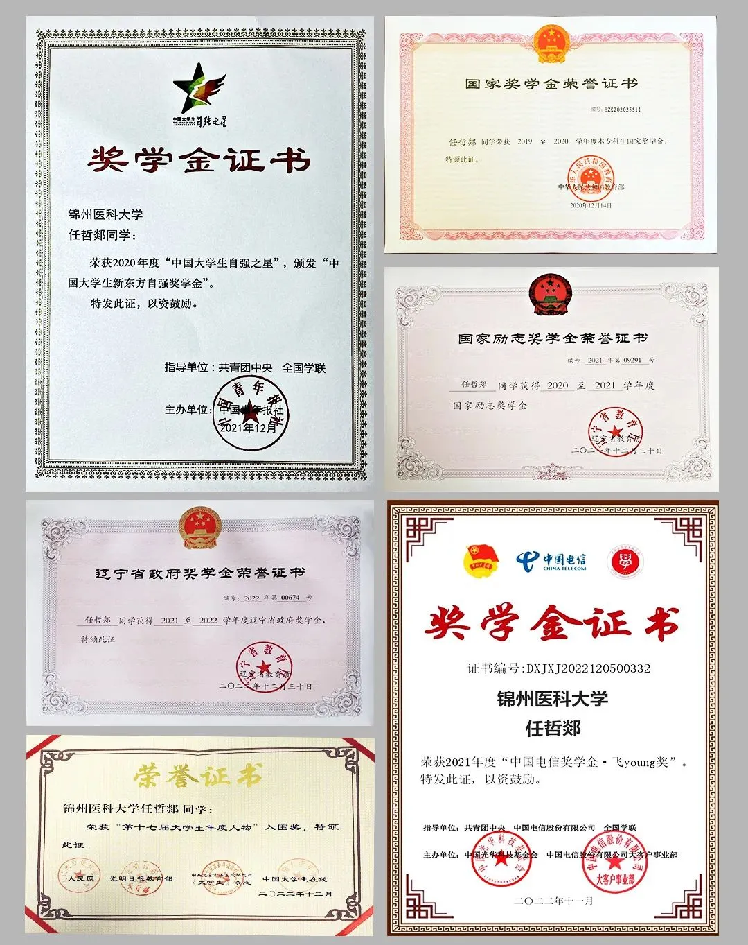 个人简介:任哲郯,男,汉族,中共党员,学校第一临床医学院2019级临床医学专业学生。以第一作者发表JCR2区论文2篇,发表学术论文6篇,专利2项,参与省部级科研项目7项。获评国家奖学金、国家励志奖学金、辽宁省政府奖学金、中国大学生自强之星奖学金、中国电信奖学金;第十七届、十八届全国“大学生年度人物”入围奖、辽宁省大学生年度影响力人物、辽宁省优秀大学生党员、辽宁省优秀毕业生等80余项荣誉。中华骨髓库人体器官捐献志愿者,在校期间创立乡村振兴品牌,推动乡村经济发展。毕业后成功考取首都医科大学肿瘤医学院(附属北京世纪坛医院)外科学专业硕士研究生。