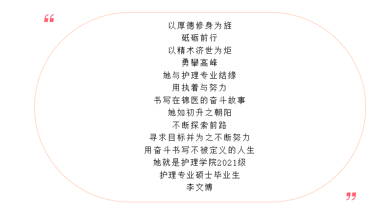 李文博,学校护理学院2021级护理专业硕士毕业生。在校期间获国家奖学金、校级一等奖学金等,获校优秀学生干部、三好学生和省优秀毕业生等荣誉称号。考取了哈尔滨医科大学护理学专业博士研究生。