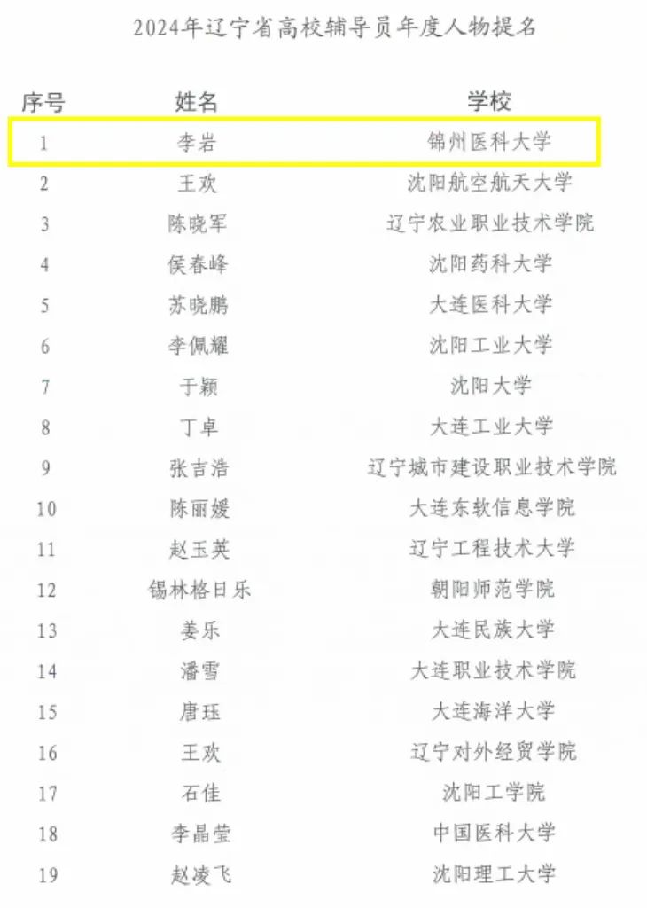近日,辽宁省教育厅公布2024年辽宁省高校辅导员年度人物推选展示活动结果,我校第一临床医学院党委学生工作部部长、学生党总支书记李岩荣获2024年辽宁省高校辅导员年度人物提名奖。