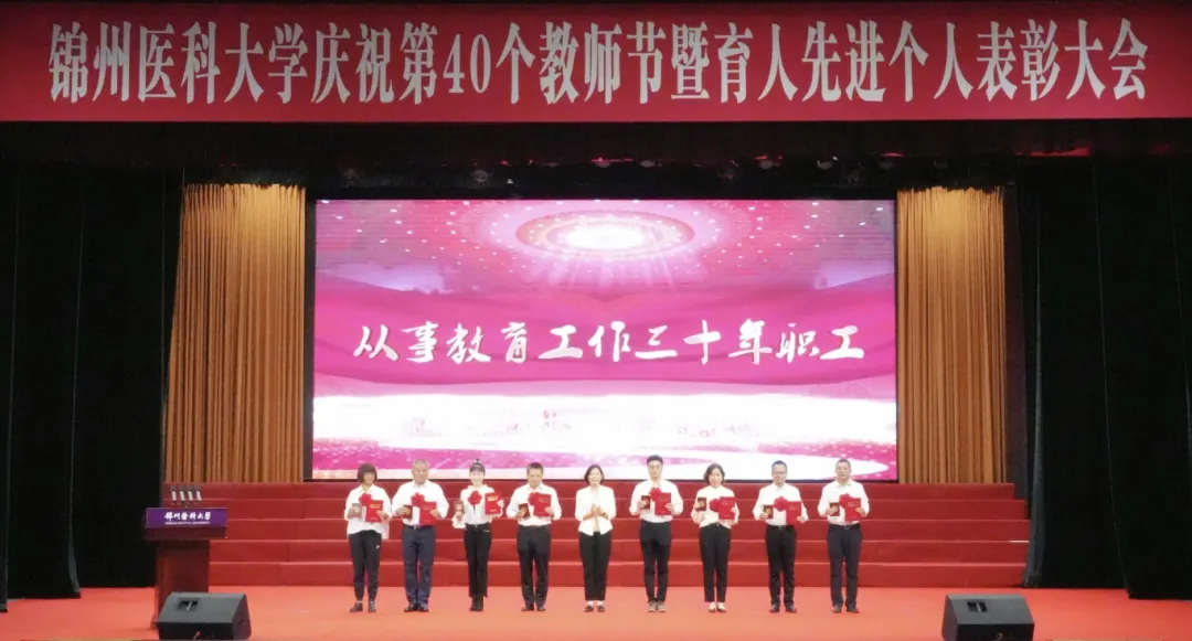 学校领导为从事教育工作30年教职工代表和辽宁省教学名师,校级教书育人标兵、服务育人标兵、教书育人先进个人等颁奖。